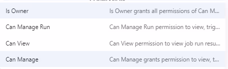Like any other component in Databricks, workflows also come with access control. There are four types of access levels available.